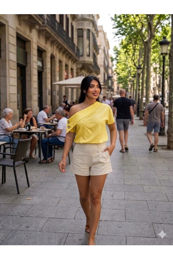Modern şehir stilini zarif bir dokunuşla buluşturan bu Sarı gömlek, günlük kombinlerinize şıklık katmak için tasarlandı. Tek omuz kesimi ve düğme detaylarıyla fark yaratan model, hem rahat hem de dikkat çekici bir görünüm sunar.