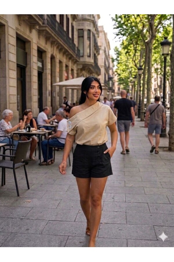 Modern şehir stilini zarif bir dokunuşla buluşturan bu taş rengi gömlek, günlük kombinlerinize şıklık katmak için tasarlandı. Tek omuz kesimi ve düğme detaylarıyla fark yaratan model, hem rahat hem de dikkat çekici bir görünüm sunar.