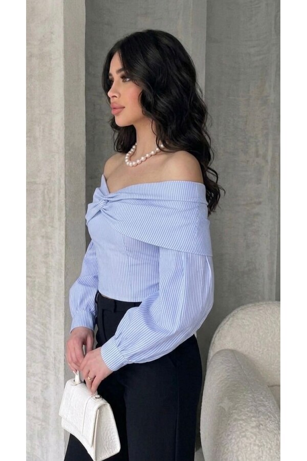 Zarif ve feminen tarzın öne çıkan parçası olan bu Mavi çizgili bluz, omuz dekolteli tasarımı ve ön kısmındaki drapeli detayıyla dikkat çeker. Yumuşak dokulu kumaşı sayesinde gün boyu konfor sağlarken, hacimli kol yapısı modern ve şık bir siluet oluşt