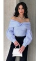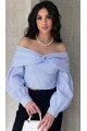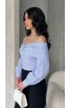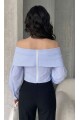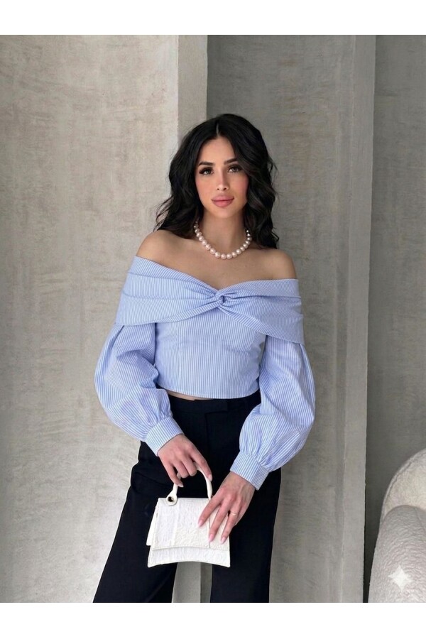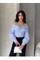 Kadın Mavi Madonna Yaka Balon Kol Crop Gömlek