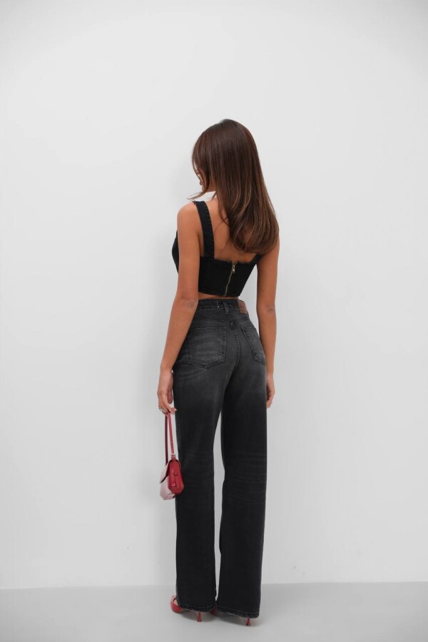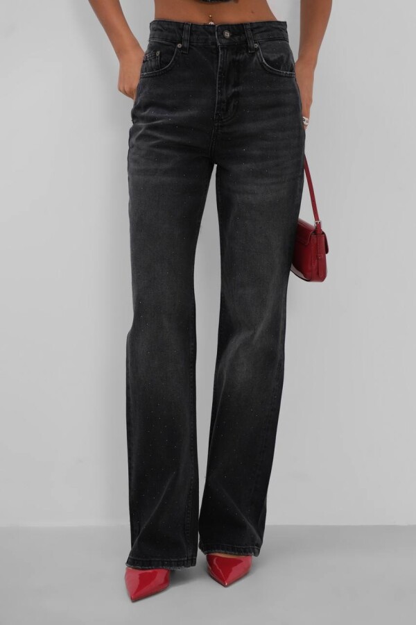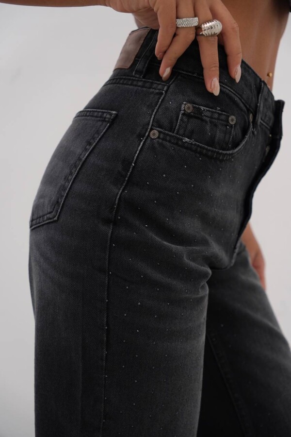 Taşlı Yüksek Bel Straight Fit Düz Paça Antrasit Kadın Kot Pantolon