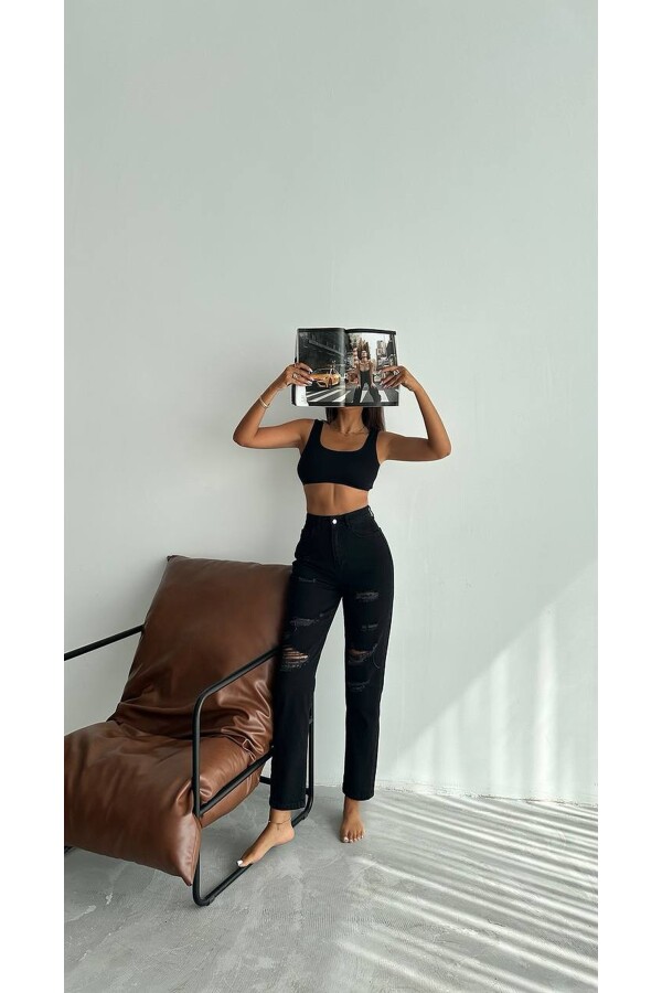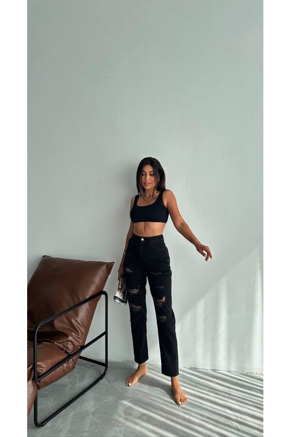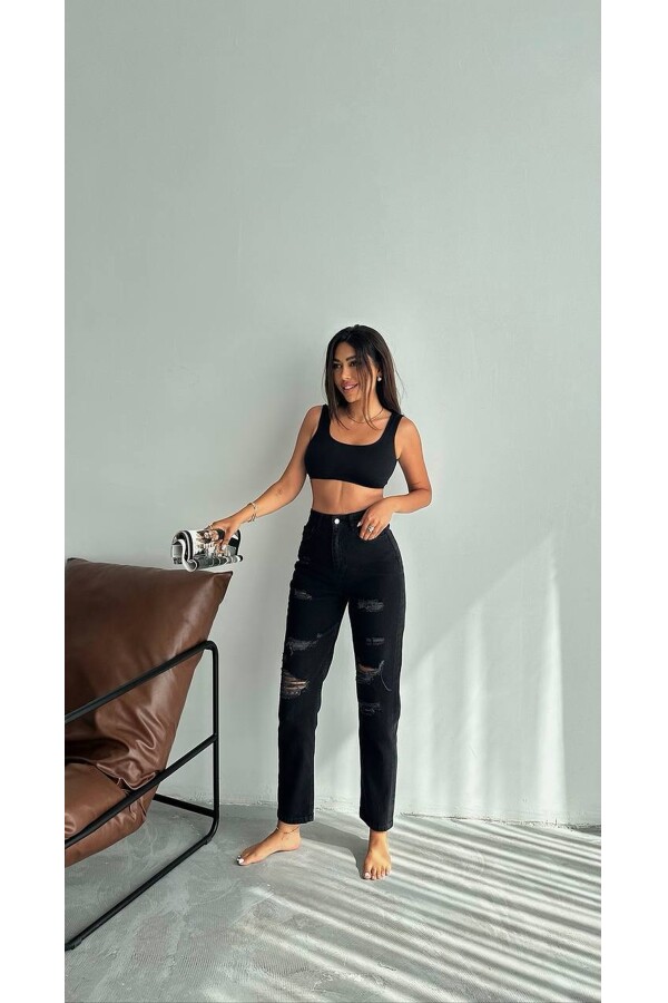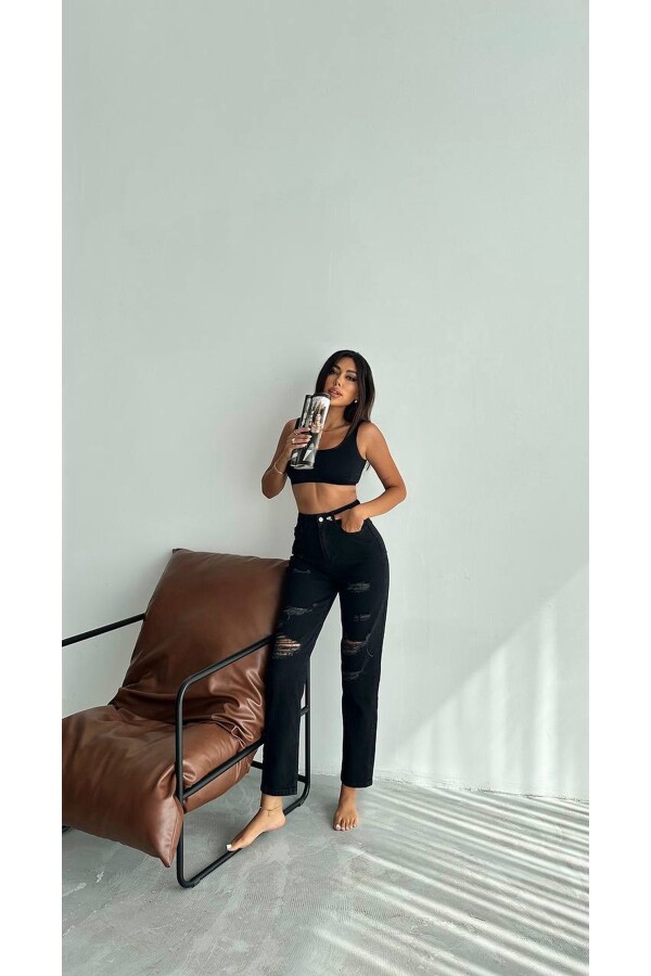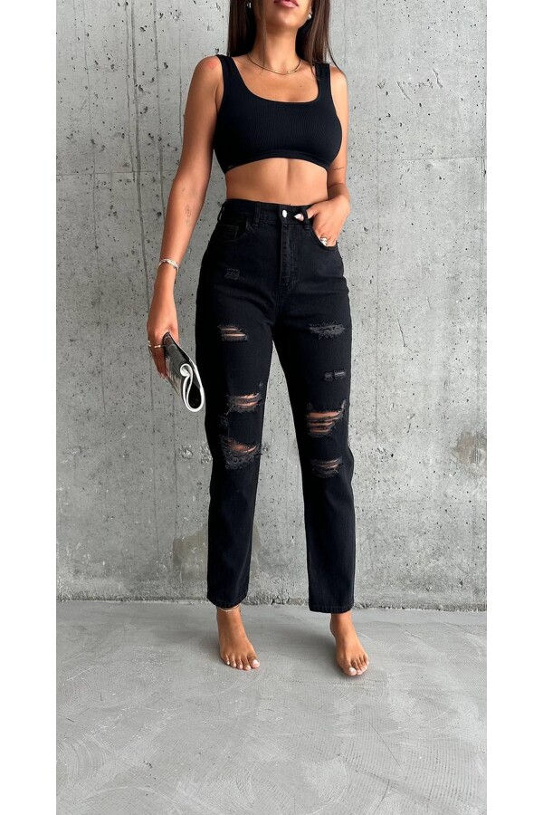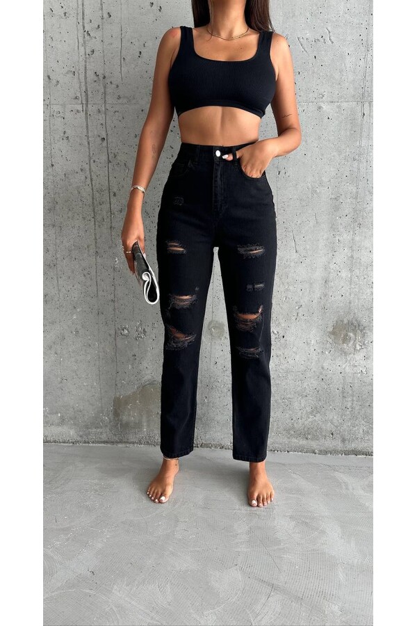 W1599 SİYAH YIRTIKLI YÜKSEK BEL MOM JEAN