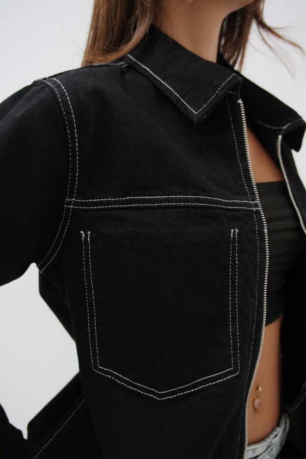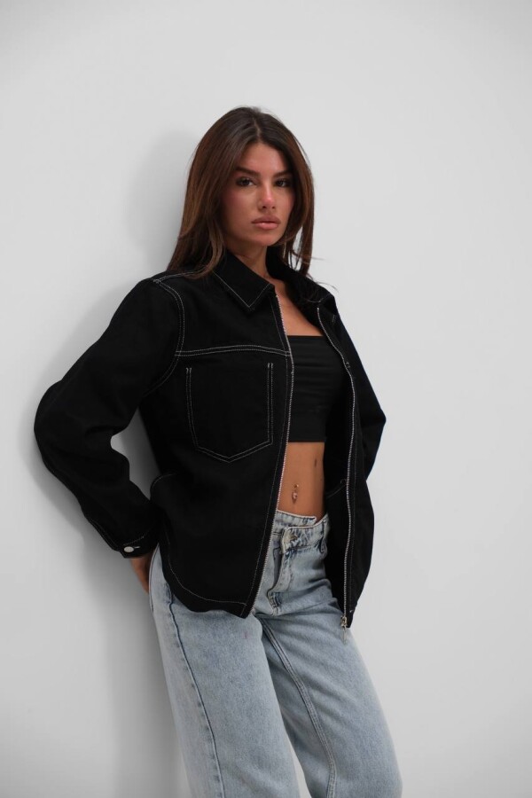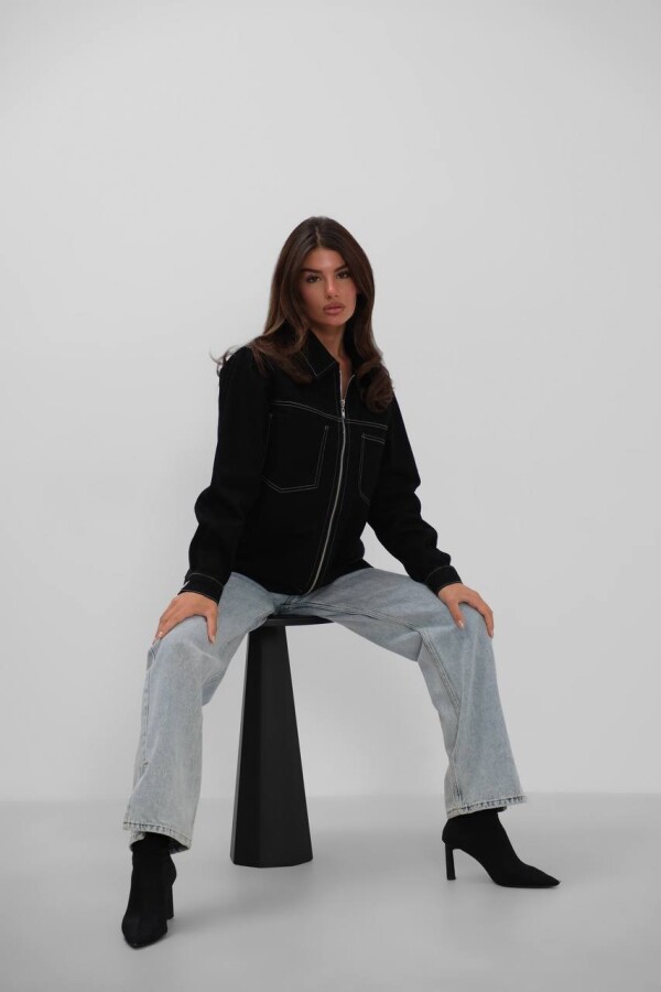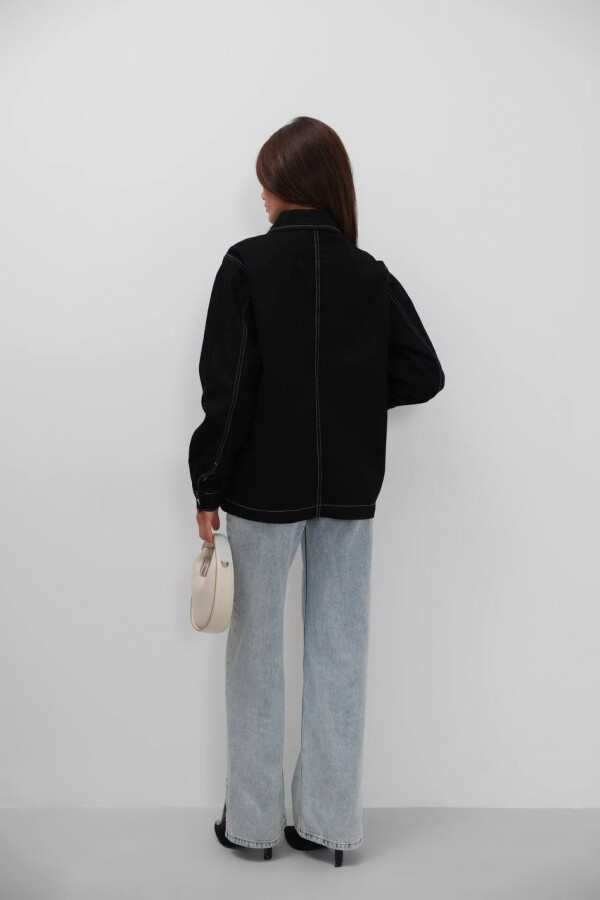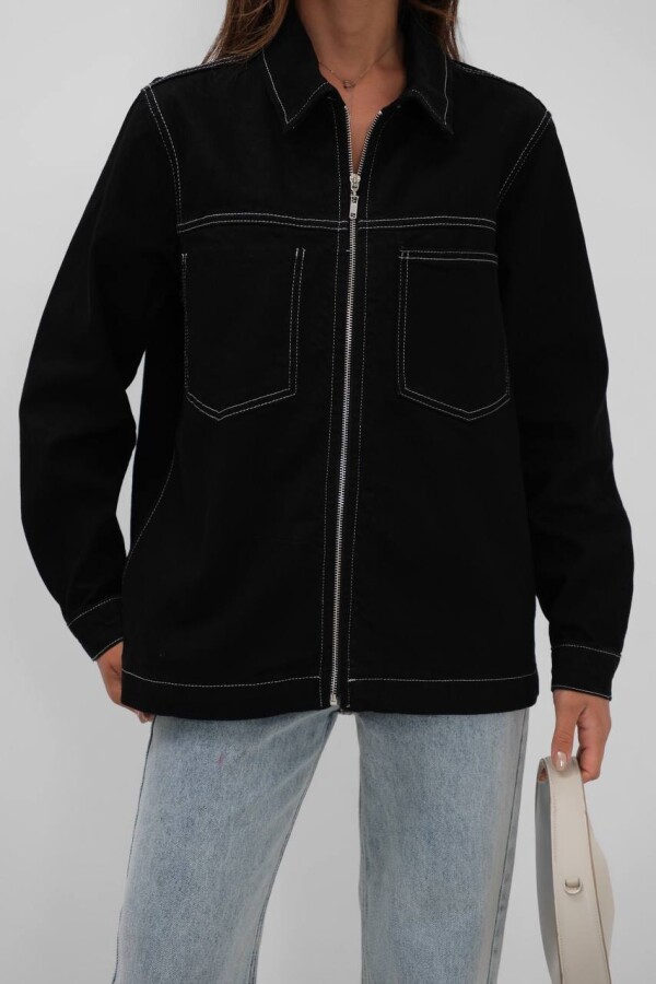 W1965 Kontrast Dikişli Fermuarlı Kadın Oversize Siyah Kot Ceket